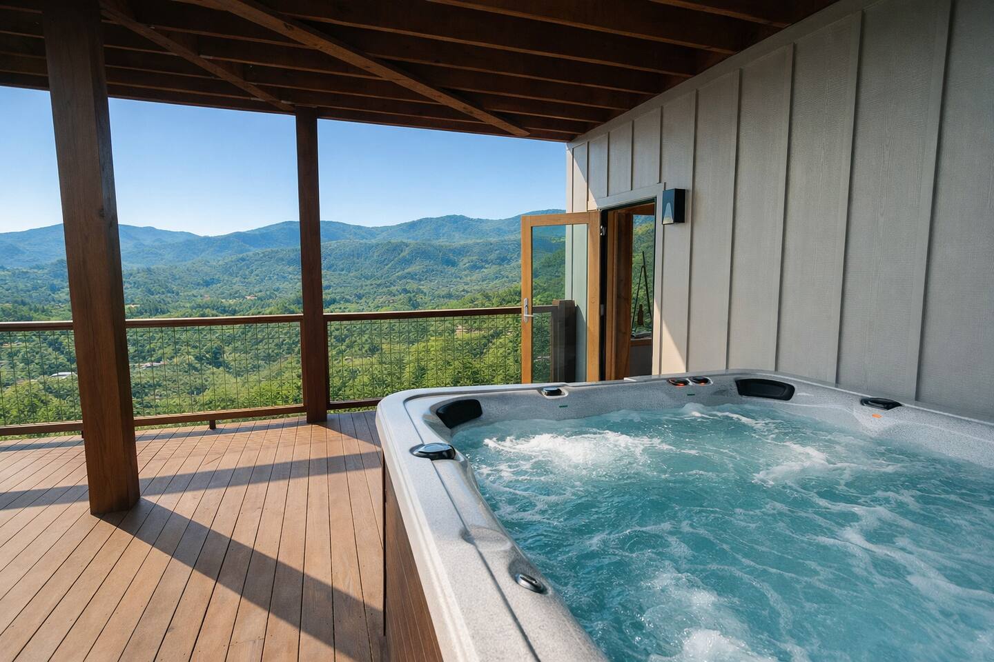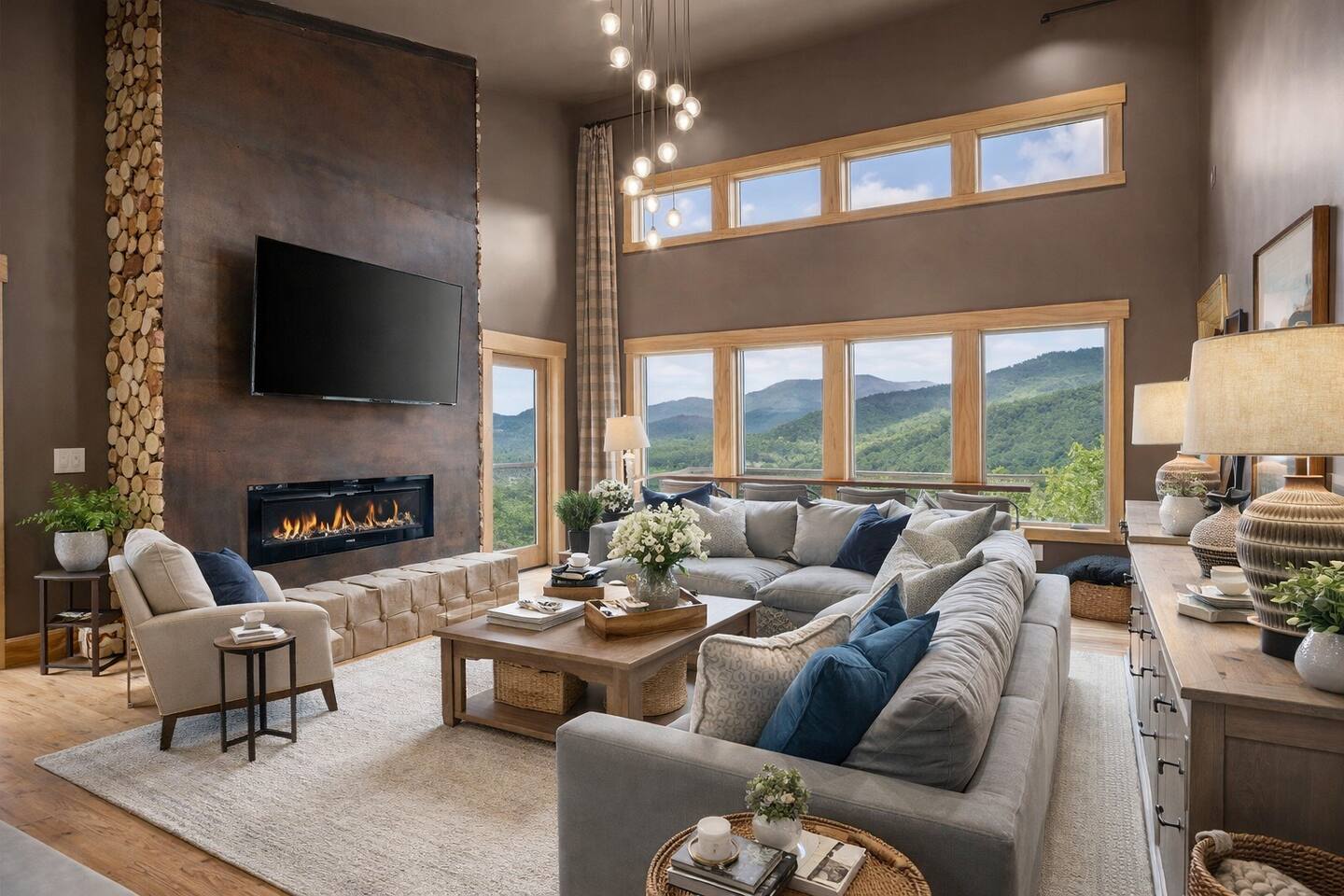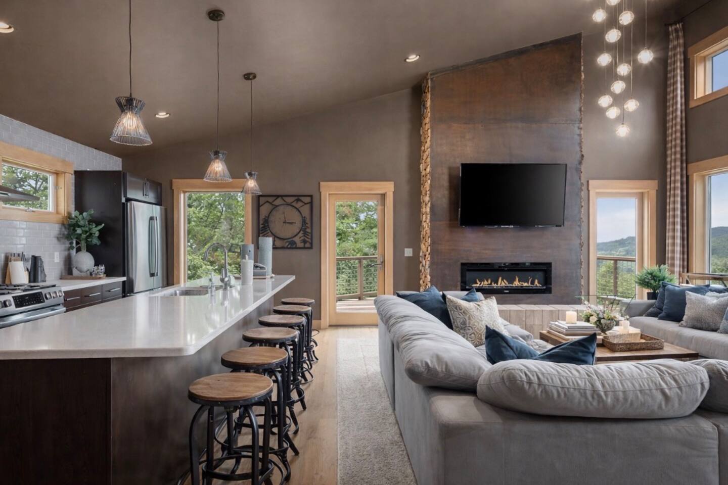 Perched in an unbelievable mountain setting with breathtaking panoramic views, this beautifully designed modern mountain villa offers the perfect blend of luxury, comfort, and unforgettable scenery. Every detail of the home was thoughtfully crafted so guests can relax, reconnect, and fully enjoy the beauty of the mountains. With four spacious bedrooms, inviting gathering spaces, and multiple outdoor decks, the home is ideal for families, couples, or friends looking for a peaceful retreat in one of the area’s most stunning locations. Main Level The primary suite is located on the main floor and serves as a peaceful retreat with a comfortable bed, private en-suite bathroom, and a quiet atmosphere perfect for unwinding after a day of adventure. Also on this level you’ll find a half bath for guests and convenient laundry facilities. The heart of the home is the open-concept kitchen, dining, and living area, designed for gathering together while enjoying the incredible mountain backdrop. The spacious kitchen makes preparing meals easy, while the dining area invites long conversations and shared moments. Step outside onto the upper deck, where a BBQ grill and outdoor lounge seating create the perfect space for morning coffee, sunset dinners, or simply soaking in the sweeping mountain views. Inside, the cozy living room offers a welcoming place to relax, watch your favorite shows, or enjoy the peaceful ambiance that surrounds the home. Lower Level The lower level features three additional bedrooms, each designed to feel warm, comfortable, and inviting for a restful night’s sleep. Step outside onto the lower deck, where the private hot tub invites you to unwind while taking in the cool mountain air and beautiful scenery. Entertainment continues downstairs with a game area featuring arcade games, shuffleboard, and more, offering hours of fun for guests of all ages. A full bathroom on this level provides added convenience for guests staying on the lower floor. ⸻ Surrounded by nature and unforgettable views, this modern mountain retreat is the perfect place to slow down, reconnect, and create lasting memories with the people you love.