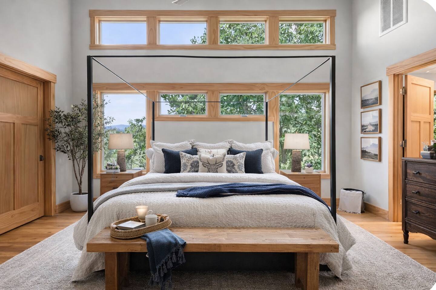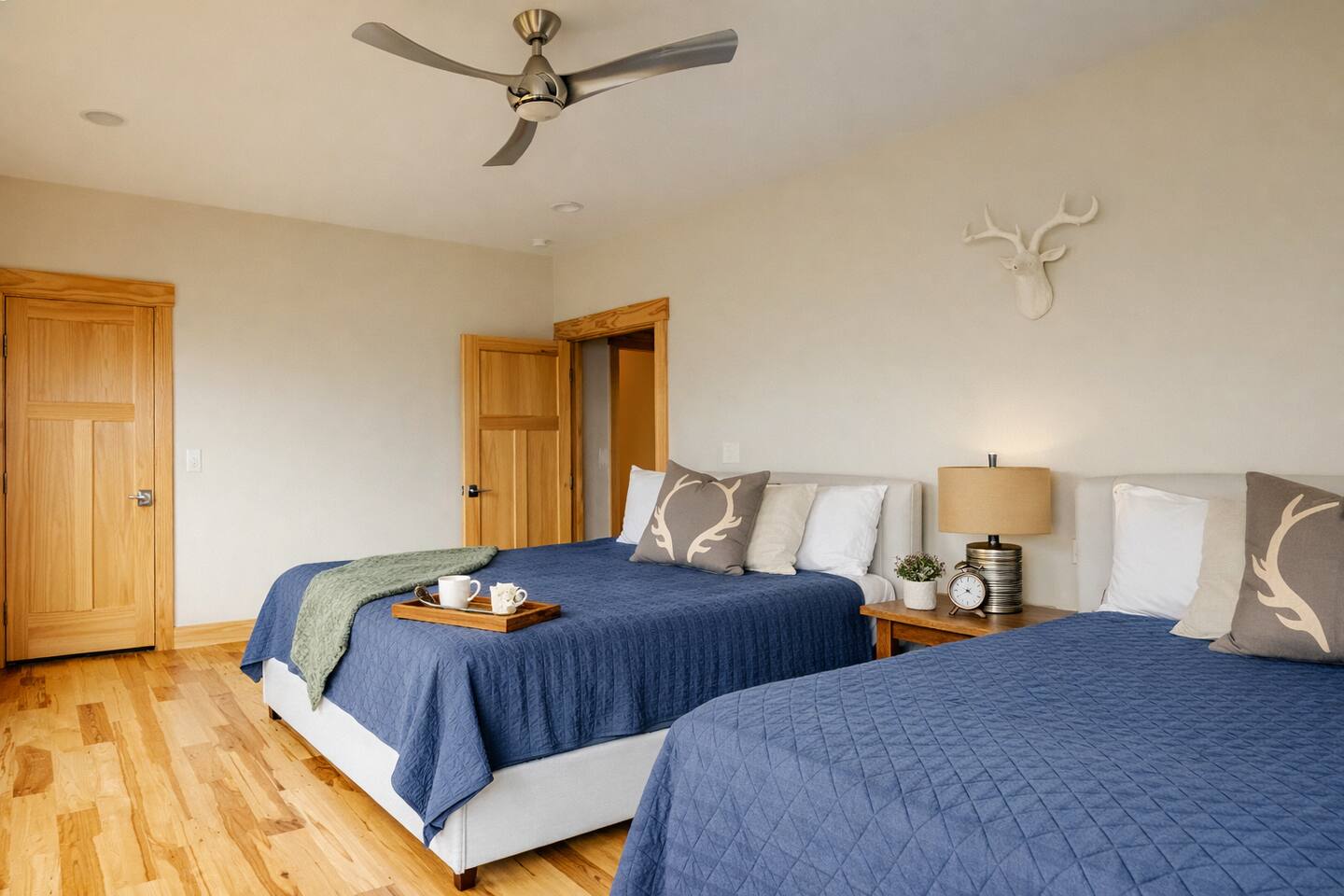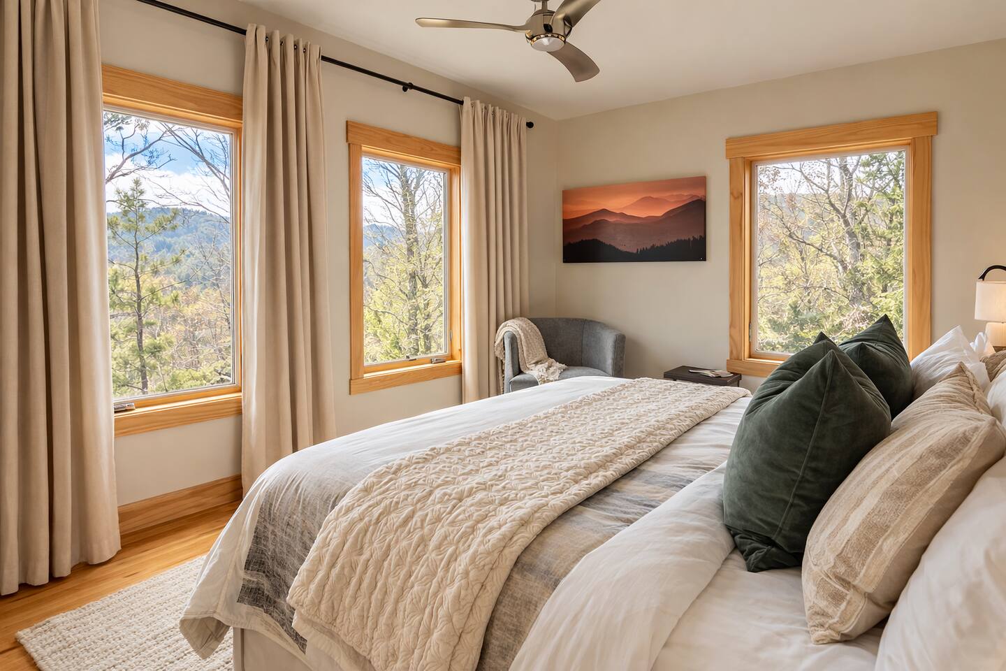 Perched in an unbelievable mountain setting with breathtaking panoramic views, this beautifully designed modern mountain villa offers the perfect blend of luxury, comfort, and unforgettable scenery. Every detail of the home was thoughtfully crafted so guests can relax, reconnect, and fully enjoy the beauty of the mountains. With four spacious bedrooms, inviting gathering spaces, and multiple outdoor decks, the home is ideal for families, couples, or friends looking for a peaceful retreat in one of the area’s most stunning locations. Main Level The primary suite is located on the main floor and serves as a peaceful retreat with a comfortable bed, private en-suite bathroom, and a quiet atmosphere perfect for unwinding after a day of adventure. Also on this level you’ll find a half bath for guests and convenient laundry facilities. The heart of the home is the open-concept kitchen, dining, and living area, designed for gathering together while enjoying the incredible mountain backdrop. The spacious kitchen makes preparing meals easy, while the dining area invites long conversations and shared moments. Step outside onto the upper deck, where a BBQ grill and outdoor lounge seating create the perfect space for morning coffee, sunset dinners, or simply soaking in the sweeping mountain views. Inside, the cozy living room offers a welcoming place to relax, watch your favorite shows, or enjoy the peaceful ambiance that surrounds the home. Lower Level The lower level features three additional bedrooms, each designed to feel warm, comfortable, and inviting for a restful night’s sleep. Step outside onto the lower deck, where the private hot tub invites you to unwind while taking in the cool mountain air and beautiful scenery. Entertainment continues downstairs with a game area featuring arcade games, shuffleboard, and more, offering hours of fun for guests of all ages. A full bathroom on this level provides added convenience for guests staying on the lower floor. ⸻ Surrounded by nature and unforgettable views, this modern mountain retreat is the perfect place to slow down, reconnect, and create lasting memories with the people you love.